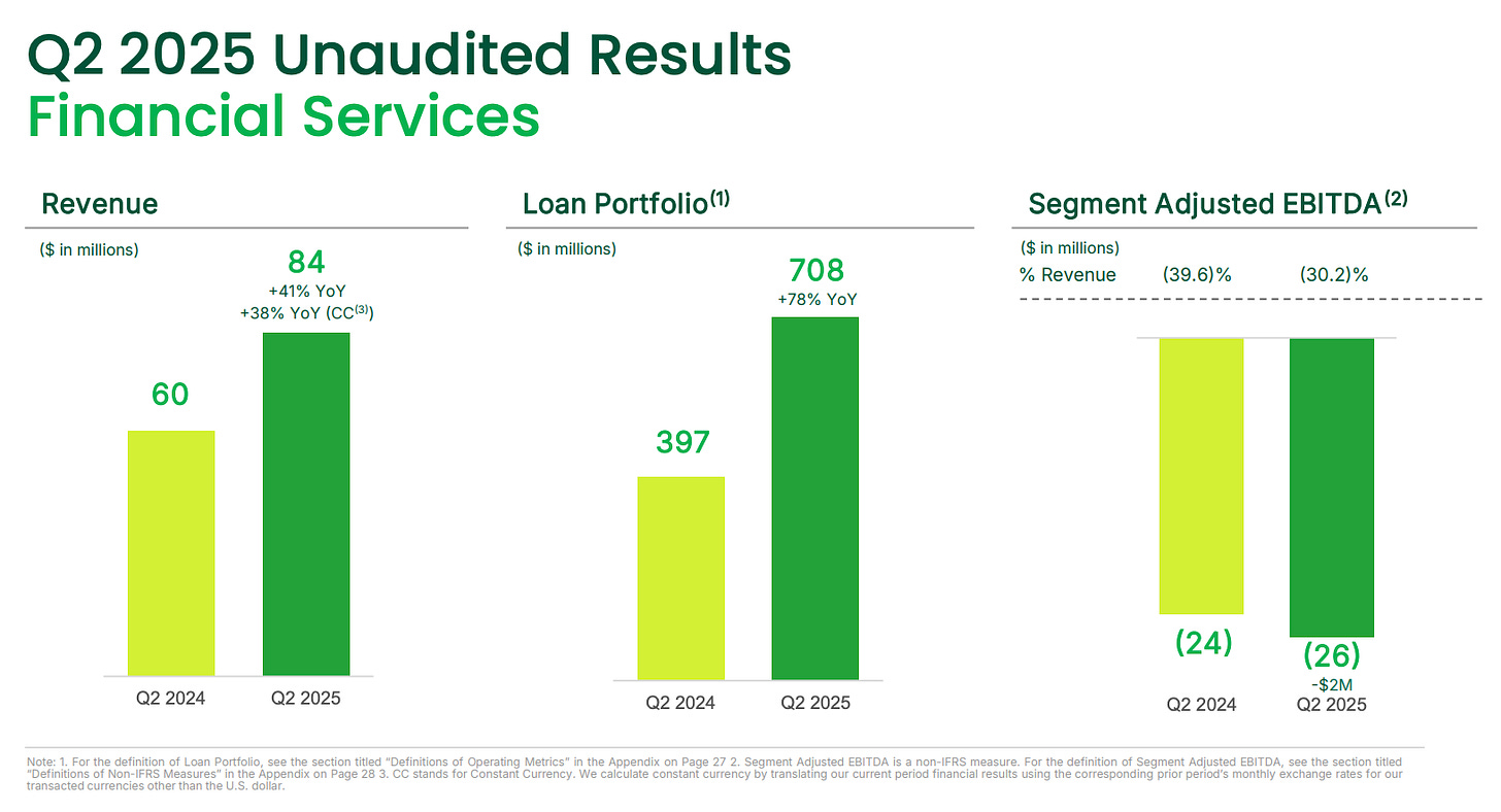 Grab’s business segments include Mobility, Deliveries, Financial Services, and Enterprise. Based on Q2 2025 results, Mobility generated $247 million in revenue (30% of total), Deliveries $356 million (43%), Financial Services $60 million (7%), and Enterprise $156 million (19%), for a quarterly total of $819 million. Annualizing and aligning with 2025 guidance of $3.33-3.40 billion total revenue, we estimate 2025 segment revenues at Mobility $988 million, Deliveries $1.42 billion, Financial Services $240 million, and Enterprise $624 million.