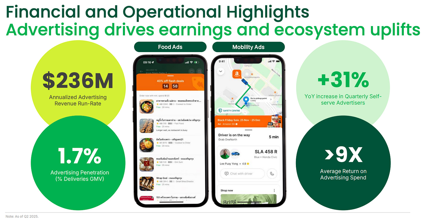 Grab’s advertising segment, known as GrabAds, has emerged as a high-growth pillar within its superapp ecosystem, leveraging the platform’s vast user base and data insights to drive targeted promotions. As of Q1 2025, Grab boasted 191,000 active advertisers, representing just 3% of its 6 million merchants, with advertising revenue contributing 1.7% of deliveries gross merchandise value (GMV). That’s up from 1.3% the previous year. By Q2 2025, this segment achieved a 31% year-over-year growth, reaching an annualized run-rate of $236 million, fueled by self-serve tools that simplify ad creation and placement for small merchants. Advertisers are drawn to Grab due to its 46 million monthly transacting users and sophisticated targeting technology, which uses transaction data from rides, deliveries, and payments to deliver personalized ads, yielding an impressive 9x return on ad spend. This network effect amplifies as more users join, creating a larger audience pool that enhances ad effectiveness, while features like the AI Merchant Assistant further refine recommendations and boost merchant engagement.