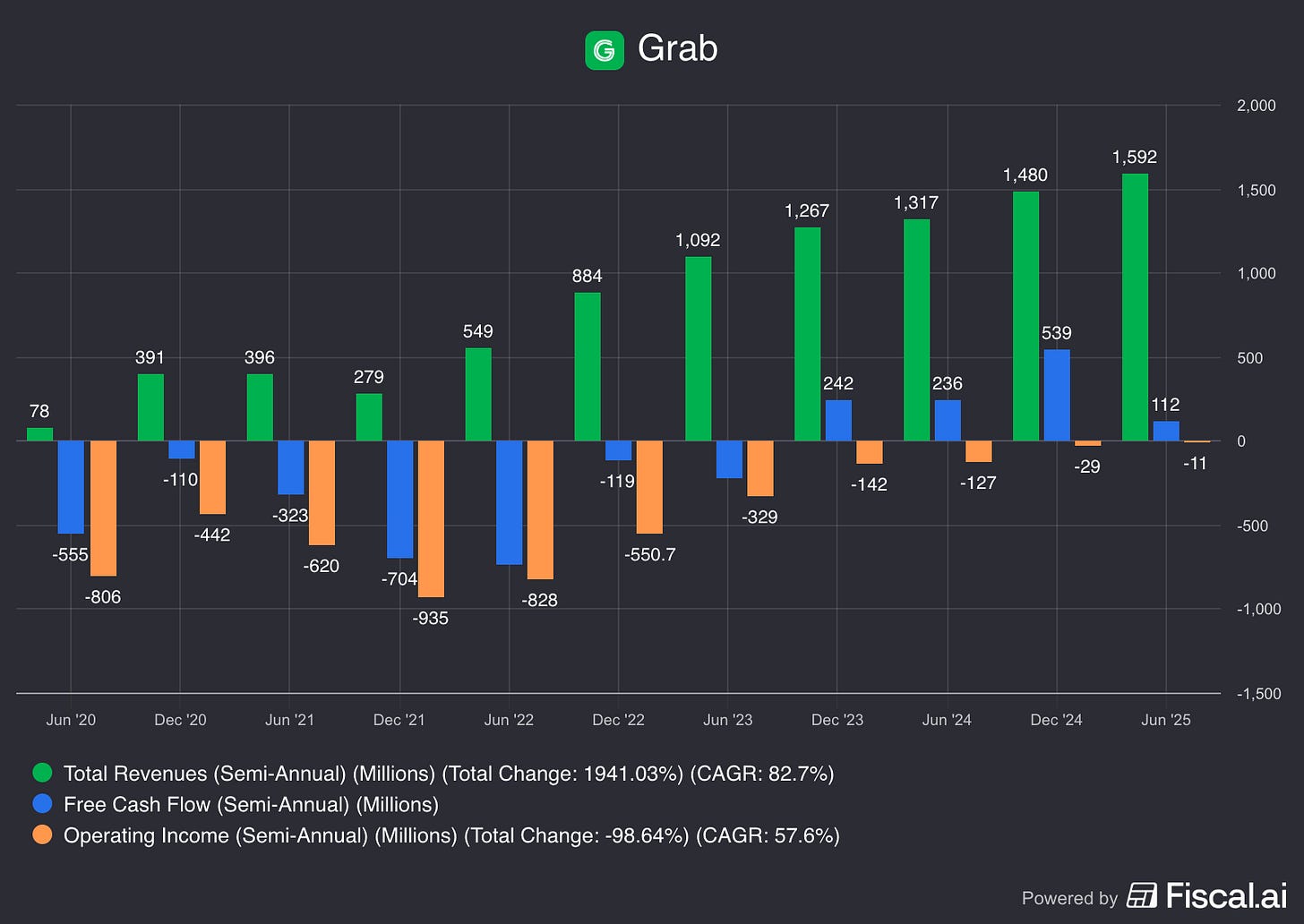 Below, we’ve compiled semi-annual financials for Grab with Fiscal.ai (great site by the way). Semi-annual view helps give historical data for the covid-era where Grab reached it’s lowest operating income.
