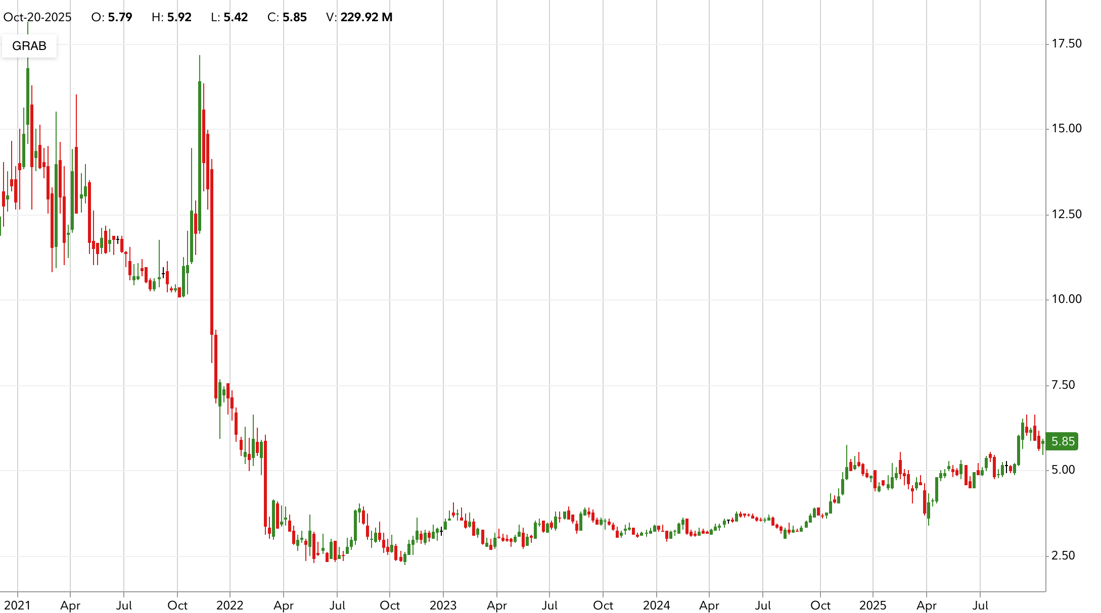 As Grab evolved, it aggressively expanded across Southeast Asia, entering markets like Singapore, Indonesia, and Vietnam by 2014, fueled by substantial venture funding and a focus on localization. The team masterfully adapted services to local languages, payment methods, and cultural preferences. Then, in 2018 a pivotal moment arrived. In a landmark deal, Grab acquired Uber’s Southeast Asian operations, solidifying its dominance in ride-hailing while integrating food delivery through GrabFood and financial services via GrabPay. This transformation turned Grab into a “super app,” offering everything from deliveries and digital wallets to insurance and lending, serving over 200 million users. By 2021, the company went public on NASDAQ through a SPAC merger, valuing it at around $40 billion at its peak. Less than two years later, the stock collapsed 80%. For multiple years, GRAB 0.00%↑ remained in the gutter, consolidating between $2-4 per share, until now.